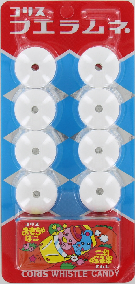 1973年(昭和48年)発売のロングセラーでピィーピィー音が鳴るラムネです。簡単なおもちゃが付いてますがこれは消費税率8%ですのでご安心を。