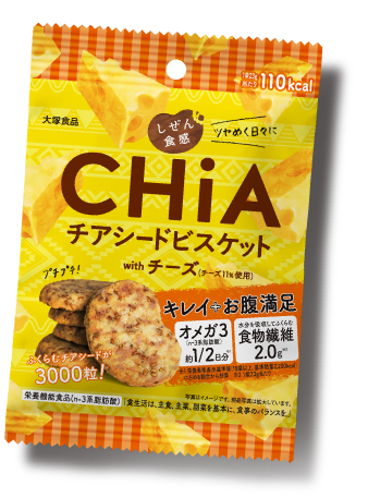 「しぜん食感」は自然の素材を活かしながら不足しがちな栄養を補い、間食のおやつとして食べることで、昼食や夕食の食べ過ぎを予防することができます。CHiAは約3,000粒のチアシードがビスケットに練り込まれたビスケット。ビスケットにすることでチアシードをしっかり噛んで食べることができるのが嬉しいポイントです。