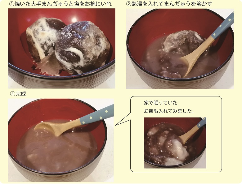 作り方:焼いた大手まんぢゅう2個をお椀にとり、少量の塩を入れ熱湯を注ぐだけ