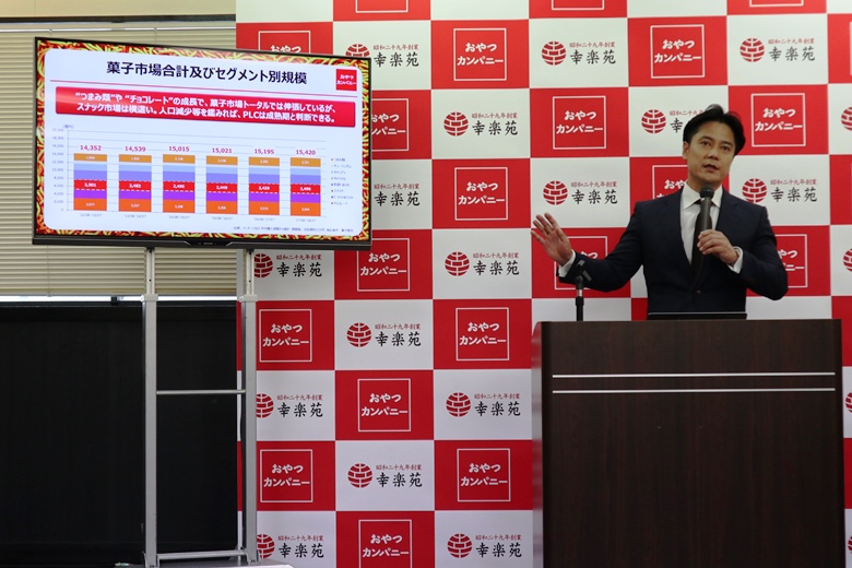 「幸楽苑とコラボした背景について。スナック菓子の市場は成熟し、厳しい状況が続く中、我々の商品を知っていただくには、やはり新しい価値、ベビースターラーメンならではの独特の価値を付与していくことが大事と考えた。ベビースターも、もともと生まれはラーメンであり、食との結びつきが深い。昨年から、ベビースターラーメンをメニューに使って頂く取り組みを行っており、その取り組みが功を奏し、(駄菓子屋さんが減り、売場が減っていたベビースターだが)逆風だった状況が数字を盛り返してきた。 今回の幸楽苑様との取り組みを通じて、お客様に喜んでいただき、その先にベビースターラーメンのこういう商品があるんだ!と手にして頂ければ大変ありがたい。」と語った。