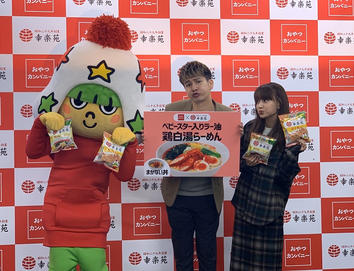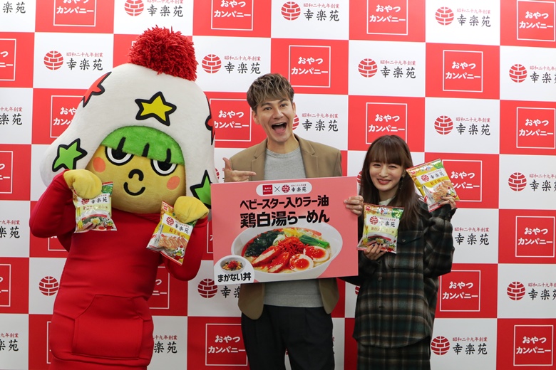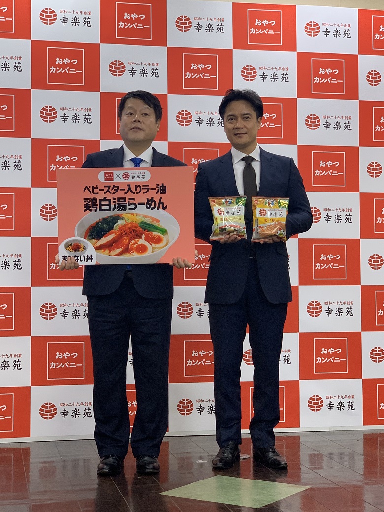 株式会社幸楽苑ホールディングスと株式会社おやつカンパニーはコラボ企画として、『幸楽苑』からは2019年10月31日(木)よりベビースター入りラー油を使った「ベビースター入りラー油鶏白湯らーめん」「まかない丼」の2品を、『おやつカンパニー』からは2019年11月4日(月)より「ベビースタードデカイラーメン(幸楽苑 餃子極味/鶏白湯らーめん味)」の2品を発売。