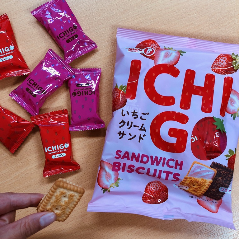 甘酸っぱいいちごクリームがプレーンとココアの2種類のビスケットにサンドされています。