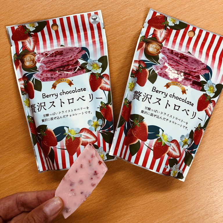 ホワイトチョコレートに甘酸っぱいドライストロベリーが贅沢に混ぜ込まれたこちら。