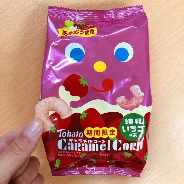 食べてみると、ふんわりサクサクのキャラメルコーンにまろやかな練乳いちごの味が合っていてとってもおいしい~!