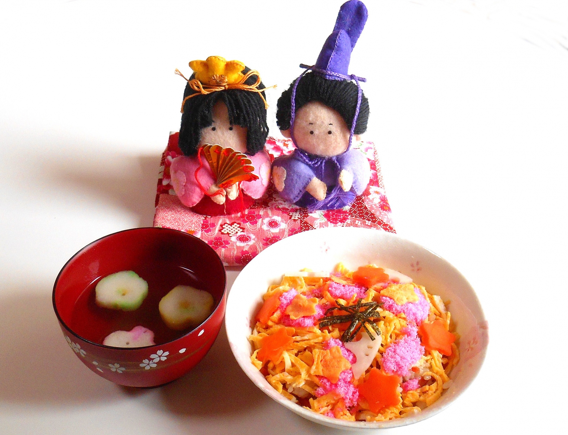 現在ひなまつりで一般的に食べられるものは「散らし寿司」「蛤のお吸い物」「桜餅」「ひなあられ」「白酒」などです。以前は他に菱餅なども供えていましたが現在はひな人形を大々的に飾る家庭も少なくなっており、菱餅を飾る事も少なくなってきているようです。