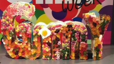 ↑いろいろなメーカーのグミで作られた「GummY」という形のオブジェ。