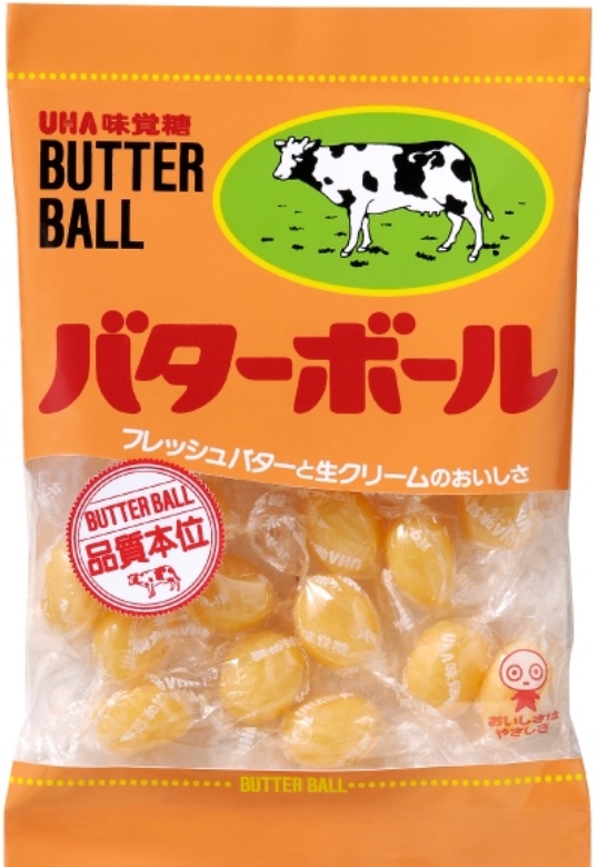 牛のイラストや“バターボール”の字体がなんとも昭和レトロな「味覚糖 バターボール」。
