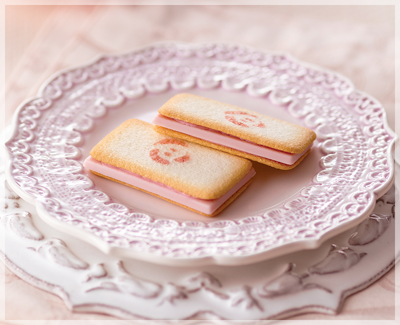 一つずつ丁寧に手摘みしたバラの花びらをホワイトショコラの中に。それをラズベリーチョコレートと混ぜ、クッキーで挟んだお菓子です。甘くみずみずしいバラの香りがふんわりと漂います。