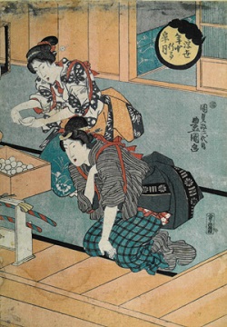 今回は、まもなく迎える端午(たんご)の節句にちなんで、江戸時代の柏餅(かしわもち)に関する版画をご紹介します。