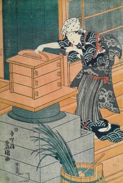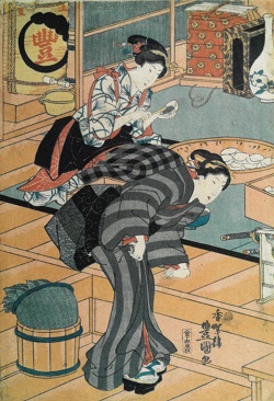 これは江戸時代末の弘化元年(1844)頃の版画 「浮世年中行事 皐月(さつき)」、作者は三代目歌川豊国(うたがわとよくに)です。3枚続きになっており、端午の節句に柏餅を作る様子が描かれています。