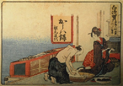 続いて中央の1枚。こちらでは奥の女性が伸ばした餅にあんを挟んでいます。左下の桶に入っているのは柏の葉だと思われます。
