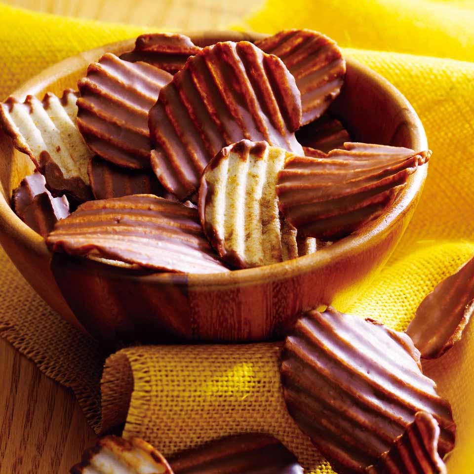 塩分がきいたポテトチップに、まろやかでコク深いチョコレートをコーティングしたお菓子です。甘味と塩味のハーモニーが絶妙で、ハマる人続出!厚みがあるので歯ごたえも抜群です。