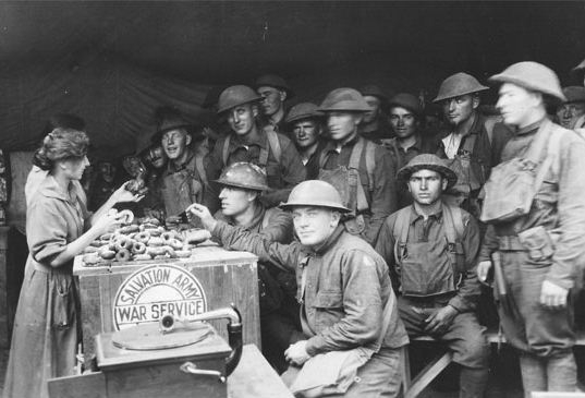 第一次世界大戦中、救世軍の女性たちが戦地のアメリカ兵を元気づけるために、ドーナツを配ったところ大好評に。終戦までに100万個以上を配ったと言われています。