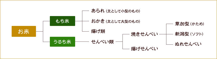 「米菓」はお米から作ったお菓子の総称で、「あられ」「おせんべい」の違い、お分かりになりましたか?
