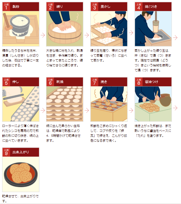 ※現在は機械化が進み、米菓工場では、精米機、製餅機、乾燥機等の改良により、工業化が確立されるようになりました