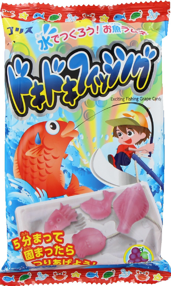 水で固めた魚のラムネを釣り上げて遊ぶ手作り菓子です。