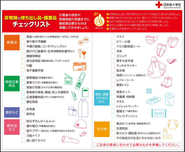 出典:日本赤十字社 東京都支部 非常持ち出し品チェックリスト