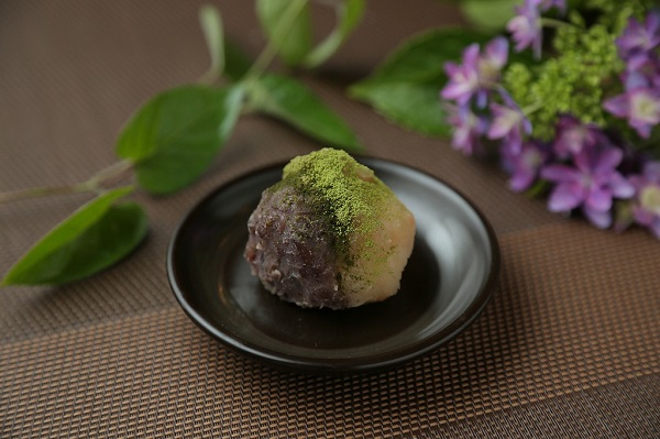 白餡と赤餡がキレイなツートーンのわがままおはぎ* 西尾抹茶がその美しさをさらに引き立てます。